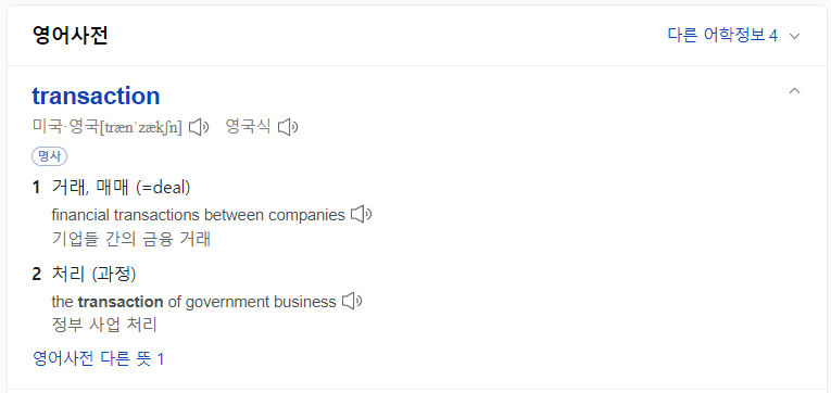 트랜잭션의 사전적 정의입니다. 네이버 사전에는 이렇게 정의하고 있네요.