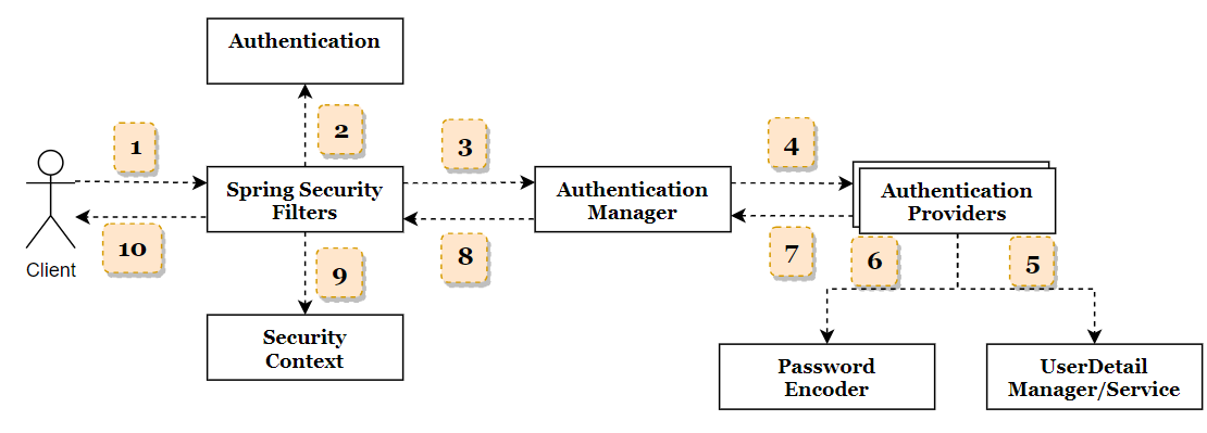 9. 나중에 사용하기 위해 필터로부터 인증 객체가 SecurityContext 객체로 저장되며 응답이 사용자에게 리턴됩니다. 같은 사용자가 다시 요청할 때에는, SecurityContext의 위의 과정을 반복하지 않고 인증 객체를 활용하여 처리합니다.