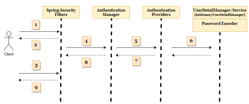 6. DaoAuthenticationProvider는 InMemoryUserDetailsManager의 loadUserByUsername() 메소드를 호출하고, 사용자 세부 정보를 메모리에 로드합니다. 사용자 세부 정보가 로드되면, 기본 password encoder의 도움을 받아 암호를 비교하고 사용자가 인증되었는지 여부를 확인합니다.