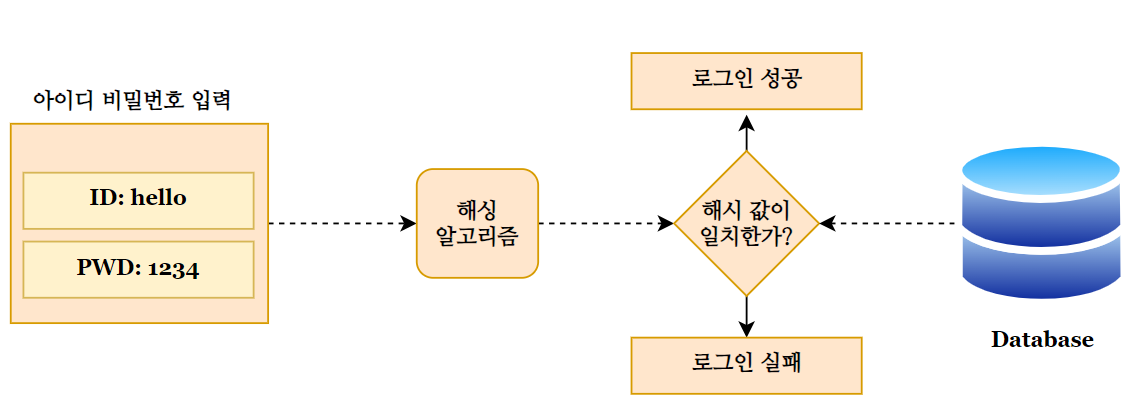 클라이언트가 아이디 비밀번호를 입력한다면, 해싱 알고리즘을 통해 데이터베이스에서 비밀번호를 가져와 해시 값이 일치하는지 비교합니다.