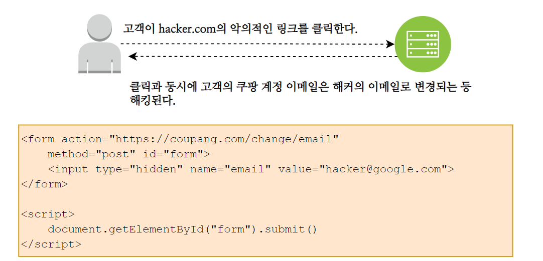 3. 고객이 악의적인 링크를 누르자마자, coupang.com에 악의적인 요청이 갑니다. 쿠팡의 백엔드 서버 입장에서는 로그인 쿠키가 이미 동일한 브라우저에 존재하고 있고 해커의 계정 정보 변경과 같은 악의적인 요청이 동일한 coupang.com이란 도메인에서 이루어지고 있기 때문에, 고객의 요청인지 해커의 요청인지 구별할 수 없습니다.