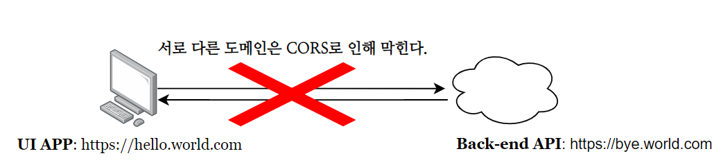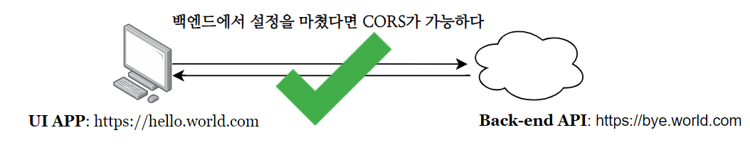 그림에서는 hello.world.com 출처에서 bye.world.com이란 다른 출처의 api를 호출했습니다. 이때 CORS를 허용해야 api를 통해 리소스에 접근할 수 있습니다. 따라서 백엔드에서 코드를 추가해 CORS를 허용해야 합니다.