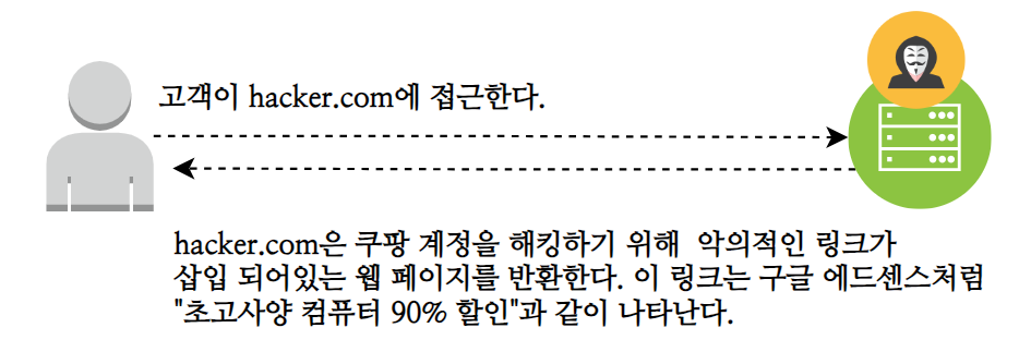 일반적인 “Cross-Site Request Forgery”(CSRF 또는 XSRF)은 명시적인 동의 없이 사용자를 대신하여 웹 어플리케이션에서 악의적인 행동을 취하는 공격입니다. 일반적으로 사용자의 신원을 직접적으로 도용하지는 않지만, 사용자의 의지와 상관없이 악의적인 행동을 취합니다. 웹사이트 coupang.com과 해커의 웹사이트 hacker.com을 한 고객이 사용하고 있다고 가정하겠습니다.