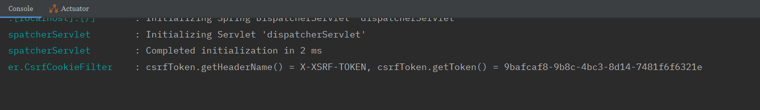 개발자는 쿠키를 만드는 로직을 수행하지 않았지만, 응답 해더에 CsrfToken의 값을 채웠기 때문에 스프링 시큐리티가 자동으로 쿠키를 만들어준 모습입니다. 백엔드 서버의 로그에 찍힌 토큰의 값과, 쿠키의 값이 9baf...로 동일한 것을 확인할 수 있습니다.