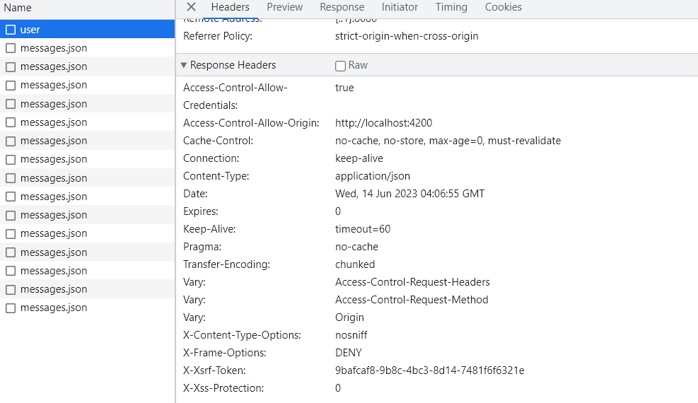 이 로직에서 응답 헤더만 보냈고 csrf 토큰 쿠키는 생성하지 않습니다. 스프링 시큐리티는 개발자가 응답 해더에 CsrfToken의 값을 채울 때마다 CSRF 쿠키를 자동으로 만들어줍니다. 한번 웹사이트에 로그인한 후 로그를 확인해보겠습니다.