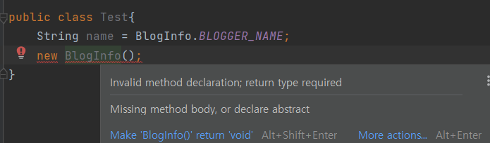 이런 식으로 코드를 작성하면 되겠습니다. 또 BlogInfo를 다른 클래스에서 생성하고자 한다면